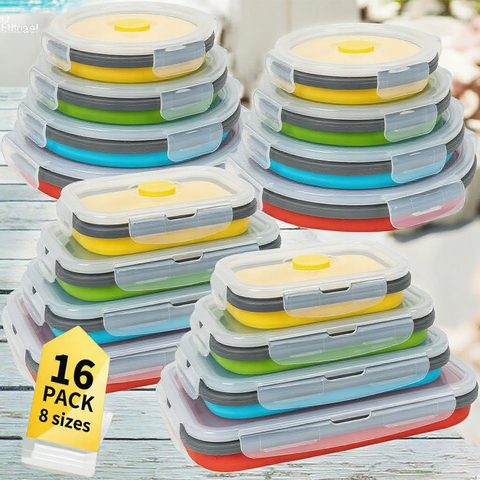 16-Pack Siliconen Opvouwbare Voedselopslagcontainers Opvouwbare Lunchkommen Set Magnetron Vriezer Vaatwasser Veilig Blauw Voedsel Doos